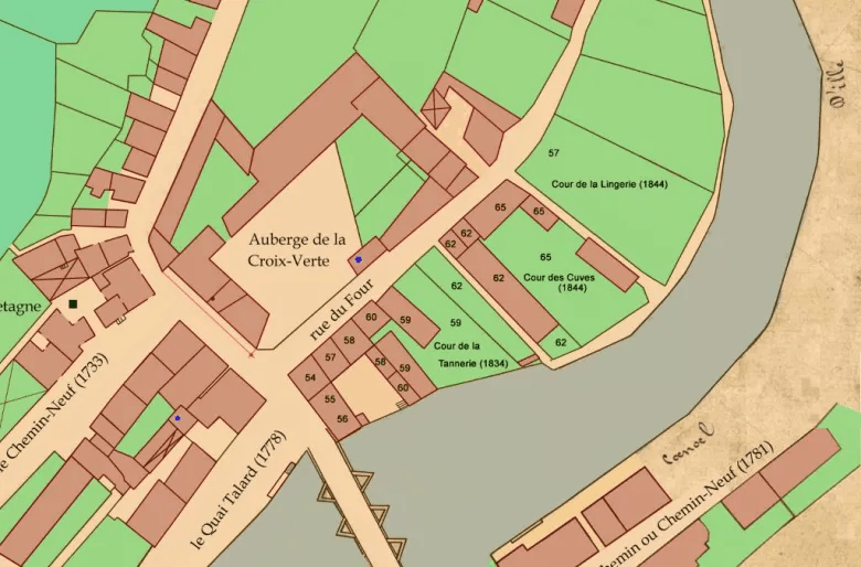 Au derrière immédiat des dites maisons de la cour de la Lingerie est la dite Cour des Cuves la grande et haute maison bordée par la rue du Four étant la maison en 1811 du dit marchand-tanneur Guillaume Le Turquis celui-ci possédant alors également cette même cour. Perpendiculaires à cette rue au derrière de cette même grande et haute maison sont les deux longs bâtiments tous deux séparés par la dite venelle de servitudes, tous deux assis respectivement pour l’un et dans la cour de la Tannerie et dans la cour des Cuves pour l’autre.