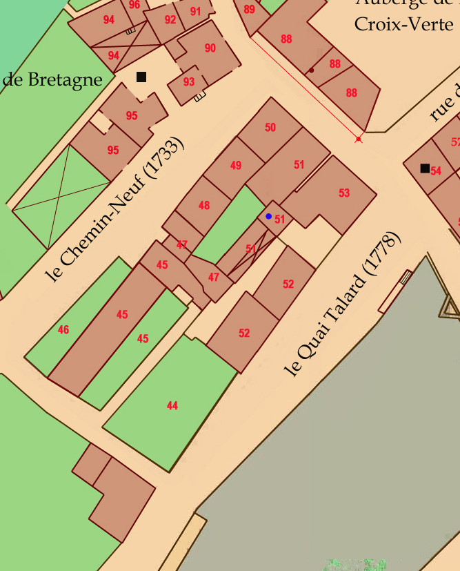 En la dite année 1811 Grillemont en le n°53, les entrepôts et l’hôtel particulier en n° 52 et le jardin en n°44 étaient le bien du sieur Charles-Lois Follen ; tout ce qui est en bleu, bien en 1693 des sieurs et Dame Cotohon, était le bien du sieur Pierre Baguelin . E tout ce qui est en vert était le bien de la veuve Hélène Salmon femme et compagne hier du sieur Christophe Leroux sieur des Aulnais celui-ci de sa charge régisseur du marquisat de Coëtquen.