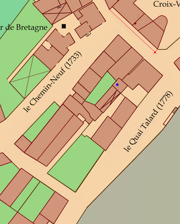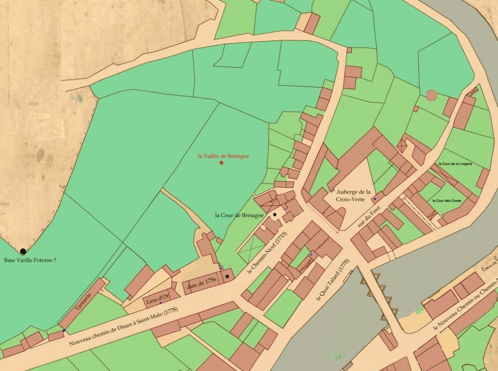 De fait en 1811, avant que celui-ci ne soit construit, il y avait à ce même emplacement assis en la cour du Tannerie qu’un jardin appartenant alors à la veuve du dit Isaac Gentils aubergiste à Dinan mais aussi propriétaire des dites cour et tannerie susdites. Et ce jardin en 1811 était lui même assis tout au long d’une grande construction édifiée quant à elle en la future « cour des Cuves ». En 1811 cette dernière construction, séparée de l’autre par la vieille venelle de servitude menant au pont et à la rivière, construction donc assise en la cour des Cuves, sera elle aussi le bien des susdits « héritiers Salmon de Hédé hier possesseurs eux aussi des dites tannerie et cour de la Tannerie (En vérité Jean Duchemin en 1880 sera à lui seul propriétaire de ces deux mêmes longs bâtiments assis pour l’un en la dite Cour de la Tannerie et assis pour l’autre en la dite cour des cuves tous deux toujours séparés l’un de l’autre par la dite venelle de servitude encore existante. Ces deux longs bâtiments n’existent plus aujourd’hui.