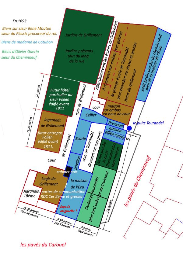 En l’année 1718 exactement, année en laquelle sera rédigé un acte de succession propre à l’auberge de l’Ecu, auberge attenant à orient le dit logis de Grillemont, il sera dit que le dit logis de Grillemont s’appuyait d’un costé aux « héritiers » du sieur Cotuhon et de la Feillée Briand. …de la manière qu’elle est describée dans le contract d’acquisition par la ditte Turpin et fait d’avec les sieur et dame de la Ville Neuve Mousset, joignant du devant au pavé de la rue du dit pont à Dinan, des costés aux héritiers du sieur de Cotuhon et femme, et de la Feillée Briand, avec le jardin en dépendant, proche le pressoir de Tourendel, joignant aux héritiers du sieur et demoiselle Cadron et au jardin des héritiers du dit sieur de Cotuhon, à charge à ceux a qui tombera cette dite lottye….