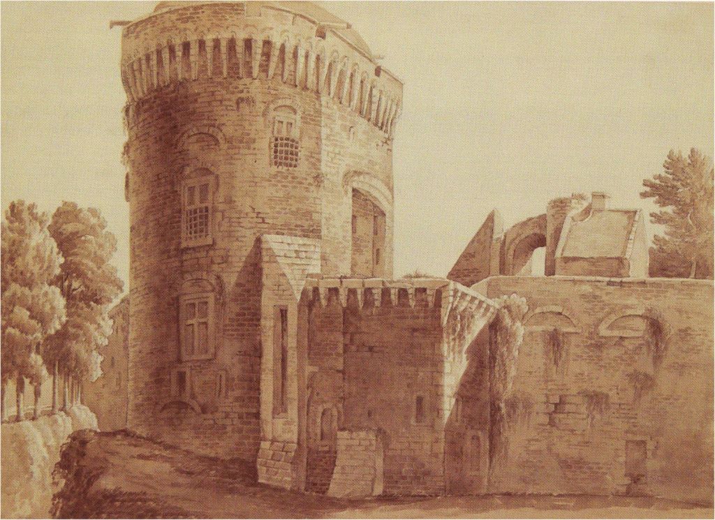 Un dessin exécuté en 1807 par François-Agathon du Petit-Bois, publié par Charles Montécot dans La Fontaine des eaux minérales de Dinan (2012), nous restitue l’aspect du château au début du XIXᵉ siècle.