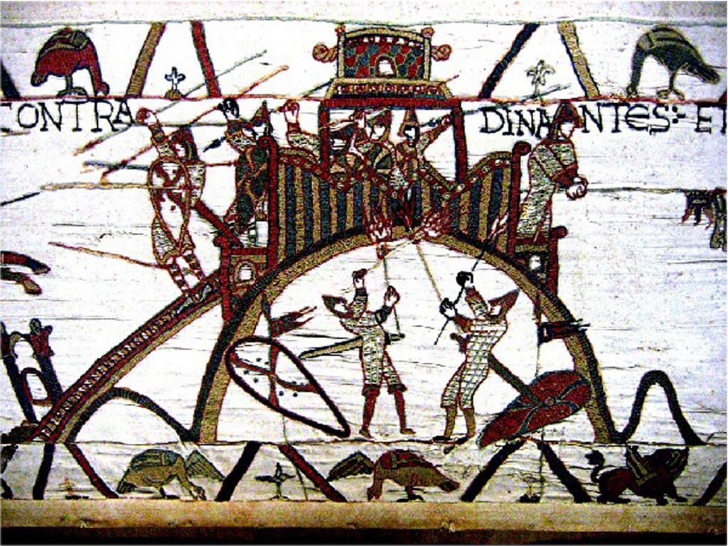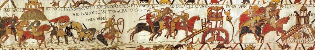 …Guillaume de Normandie proche du Mont-Saint-Michel traversa la rivière du Couesnon (Cosnonis) et ses hommes s’enlisèrent en les sables mouvants. Ils ne durent leurs vies sauves tirés de la mort que parce que le duc Harold les retira tous du sable. Puis Guillaume et ses hommes allèrent à Dol forçant le duc Conan II de Bretagne à prendre la fuite pour trouver refuge en les murs fortifiés de Rennes…