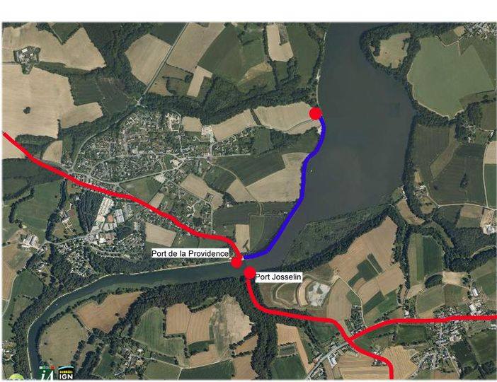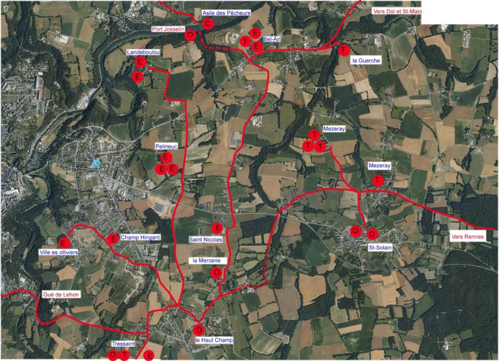 Le chemin de Lestra (tracé rouge) — du latin strata — reliait Corseul aux ports jumeaux de Josselin et de la Providence.