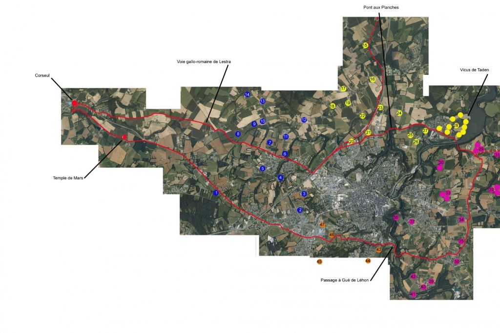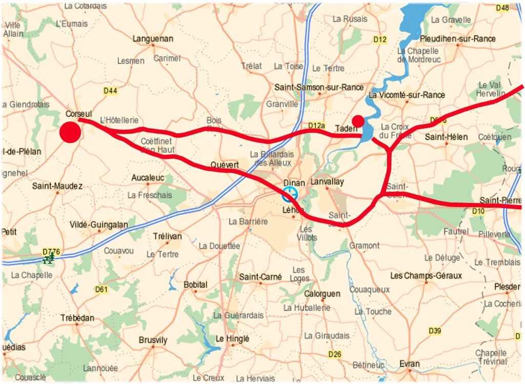 On y distingue nettement le tracé rouge d’une seconde voie gallo-romaine, issue de Corseul. Après avoir franchi la Rance à gué — à l’emplacement du pont actuel de Léhon — elle passait au plus près du temple de Mars, dressé au sud de la capitale des Curiosolites.