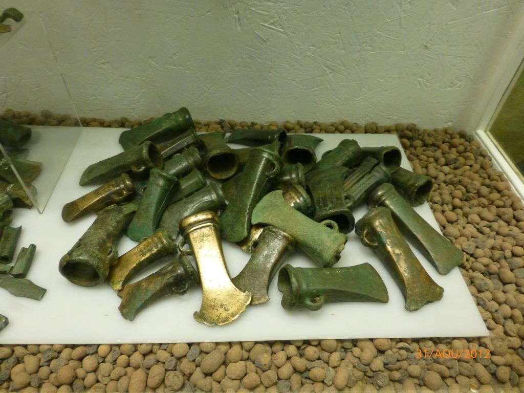 Ici les Haches à Douilles exposées en le musée du castel de Colchester, en Angleterre; reconstitution d’une éventuelle Haches à Douille dite d’apparat. Elles auraient pu être les précurseurs de la pièce de monnaie.