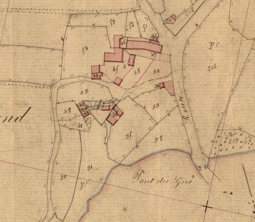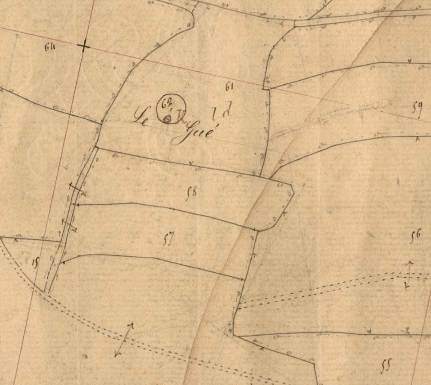 Le moulin à vent sur le promontoire de la parcelle n°62 n’existe plus ; en 1844 seule l’appellation « le Gué » est restée au lieu.