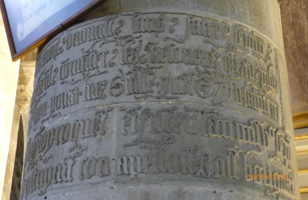 Mil 557 et 58 Phi.Deduit, P.Dubouays, Re.Labert, T.Artur, Guy Ravenel Fabriqueurs thésauriers ont fait asseoir cestz quatre pilliers – Le XX et un jour du mois d’aougst sans faire sejour ce beau cueur firent comacer les trésoriers qlx ece pilier sont nomez coe vous pourez lire Guill.Picot , Guy de Saint Cire , Xgn Tourondel , Geoffroy Roquet et fut en lan mil Vcc sept par le meste de cestuy art con apelloit Roll.Bougnart.