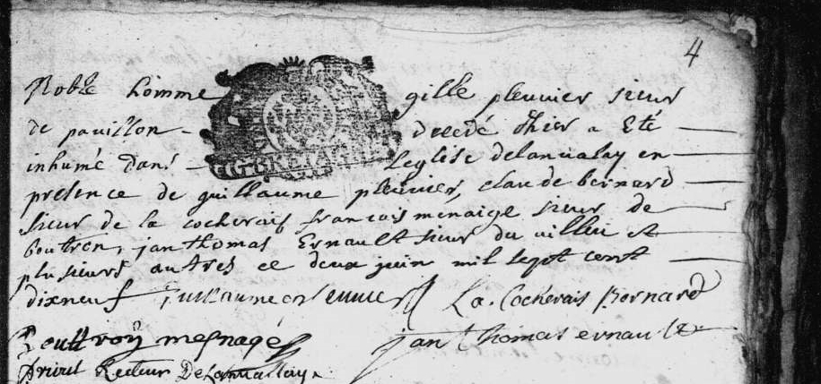 .…Noble homme Gille Pleuvier sieur du Pavillon, décédé dhier a été inhumé dans l’église de Lanvallay en présence e Guillaume Pleuvier, Claude Bernard sieur de la Cocherais, François Mesnaige sieur du Boutron, Jan-Thomas Ernault sieur du Villeu et plusieurs autres ce deux juin mil sept cent dix neuf…