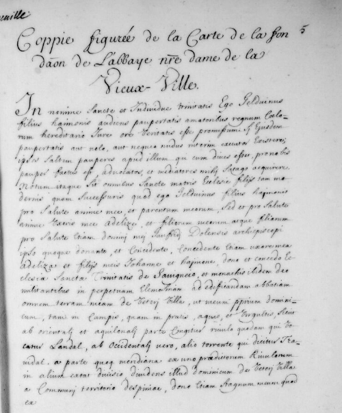 Sachez donc tous, fils de la sainte Église, présents et futurs, que moi, Gelduin fils d’Hamon, pour le salut de mon âme et de celle de mes parents, de mon épouse Adélize, de mes fils et de mes filles, et pour le salut de l’âme de mon seigneur Geoffroy, archevêque de Dol – avec son accord et sa donation – ainsi qu’avec le consentement de mon épouse et de mes fils Jean et Hamon, je donne et concède à l’Église de la Sainte-Trinité de Savigny et aux moines qui y servent Dieu, en pure et perpétuelle aumône, toute ma terre de Vieuville (Veteri Villa), pour y bâtir une abbaye.