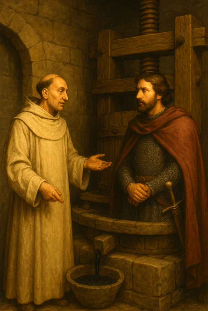 — Du pressoir (torculari), le même prieur percevra la moitié des revenus, et ledit Olivier fournira le bois nécessaire à l’entretien du pressoir.
