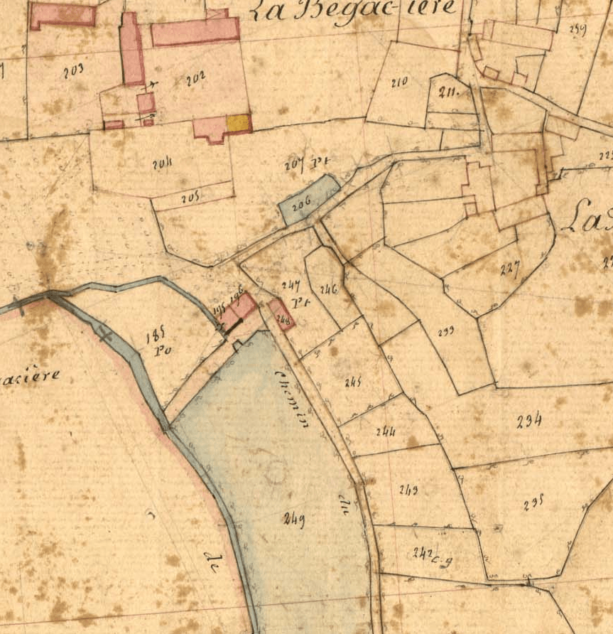 Lorsqu’il était encore en activité voici le moulin de la Begassière assis en dessous de son château (devant celui-ci était son grand bassin de retenue d’eau comme l’atteste le plan de 1844 ci-dessous. Le petit chemin d’accès ici à la droite de ce bassin, chemin déjà existant en la dite année 1844 et menant à la rivière, à Chantoiseau, de nos jours n’existe plus avalé qu’il a été par l’actuel sous-bois).