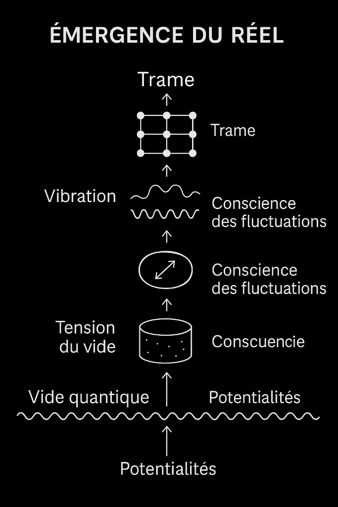 Ainsi, le vide n’est jamais totalement stable : il frissonne, il palpite, il oscille sans cesse, et c’est précisément de ces oscillations que naissent les premières vibrations du réel (de la Trame. Ce que nous appelons le Réel ou la Trame : La Trame n’est rien d’autre que le tissage actif des vibrations issues du Vide, des résonances retenues par la Conscience, des nœuds formés par les fluctuations, et des ondes qui les relient. C’est la Trame qui rend possible la forme.