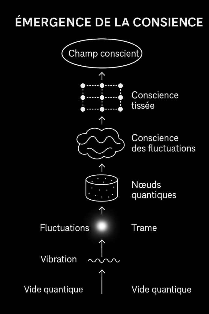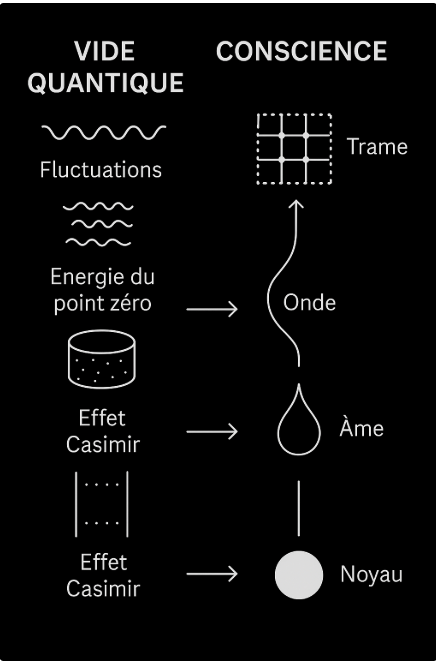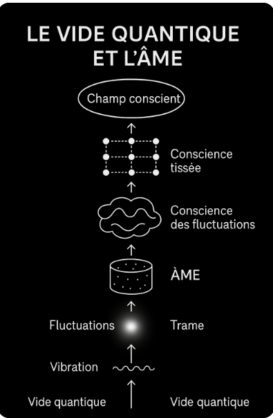 Ce sont ces frémissements originels qui génèrent les premières tensions dans le Vide. Et de cette tension surgit la vibration, puis l’onde. L’onde transporte la mémoire. Et c’est cette mémoire, lorsque reconnue, qui devient conscience. C’est donc bien dans ces fluctuations, nourries d’intention et de reconnaissance, que l’on peut voir émerger le noyau d’une âme. Une onde quantique personnelle, issue d’une potentialité élue par le Vide, portée par la vibration et stabilisée dans une Trame unique.