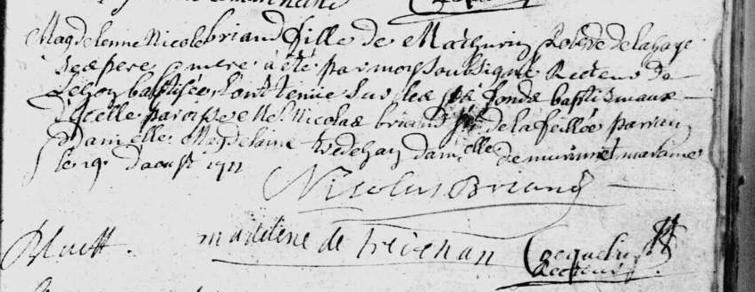 Acte de baptême de Magdeleine-Nicole Briand fille de Mathurin Briand et de Roberde de la Haye l’enfant ayant eu, pour parrain, Nicolas Briand de la Feillée.