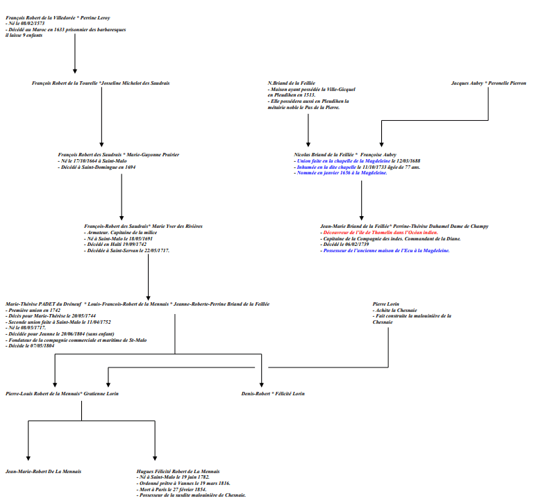 Jeanne-Roberde-Perrine Briand de la Feillée née le 20/10/1730 prendra pour époux le 11/04/1752 l’armateur malouin « Louis-François Robert de la Mennais.