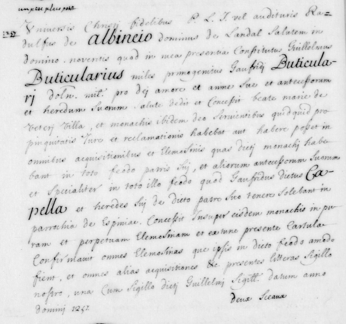 Ego Radulfus de Albincio dominus de Landal salutem in Domino. Noveritis quod in mea presentia constitutus Guillelmus Buticularius miles, primogenitus Gaufredi Buticularii, dedit, concessit et pro Dei amore et anime sue et antecessorum et heredum suorum salute, dedit et concessit beate Marie de Veteri Villa et monachis ibidem Deo servientibus quidquid prioratus jure vel reclamatione habebat aut habere poterat in parrochia de Espiniaco in elemosina, quam dicti monachi habebant ab antecessoribus suis in toto feodo patris sui, et aliunde antecessores sui habebant in toto illo feodo quod Gaufredus dictus Capella et heredes sui de dicto feodo tenere solebant in parrochia de Espiniaco. Concessit insuper per eidem monachis in puram et perpetuam elemosinam et extunc presente Cartula confirmavit omnes elemosinas quas ipsi in dicto feodo amodo fient, et omnes alias acquisitiones. In presentiam litteras sigillo meo una cum sigillo dicti Guillelmi sigillavi. Datum anno Domini 1257.
