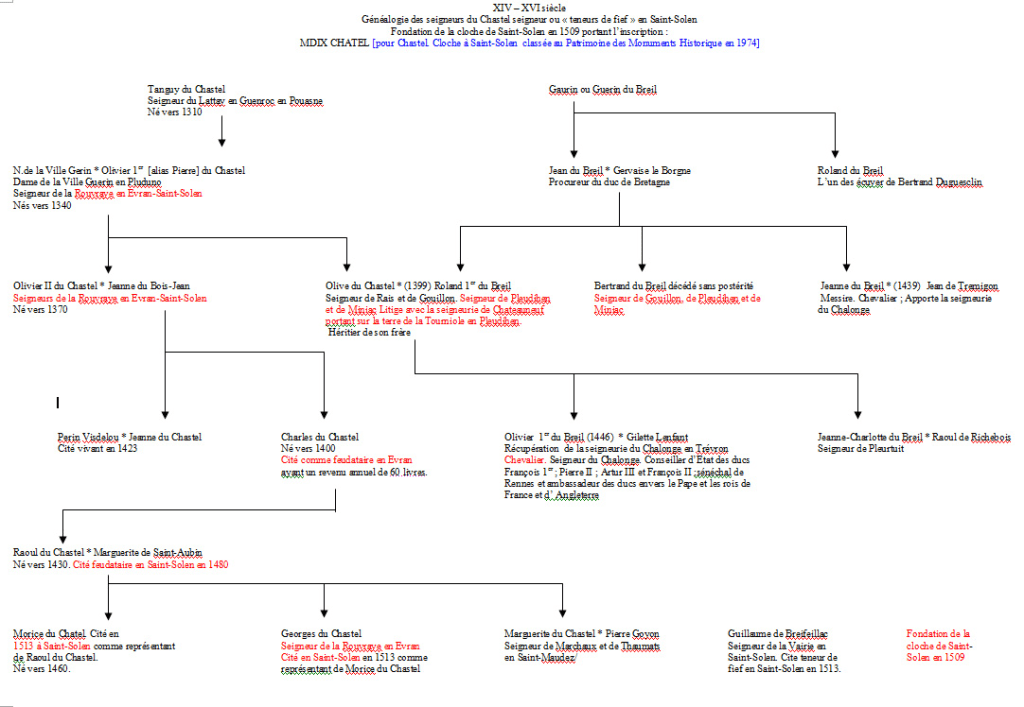 A ce titre sera cité en 1480, pour Saint-Solen donc, comme y étant un « teneur de fief » à part entière, Raoullet Chastel. Les Chastel de la Rouvraye sont donc très certainement depuis le XIV siècle, seigneurs qu’ils sont en leurs propres terres, en très étroites relations avec la paroisse de Saint-Solen ; d’ailleurs leurs droits seigneuriaux de la Rouvraye ne touchent t’ils pas aussi les limites même de la paroisse de Saint-Solen ?