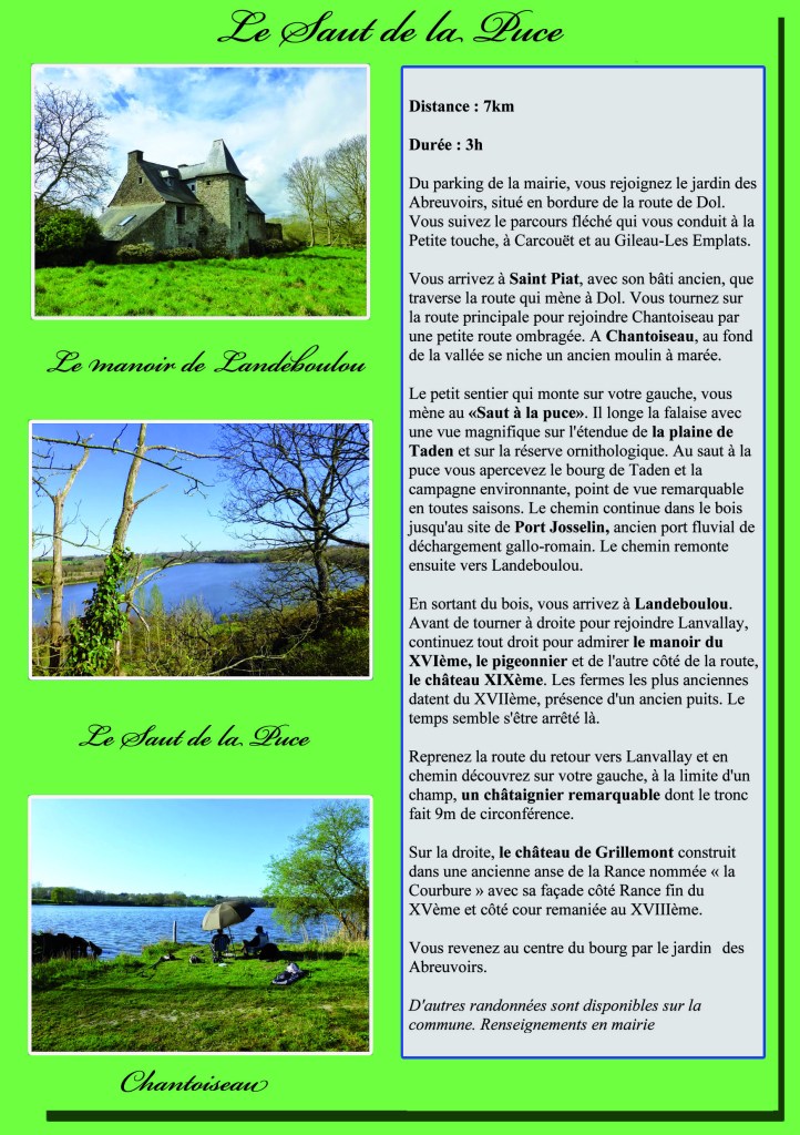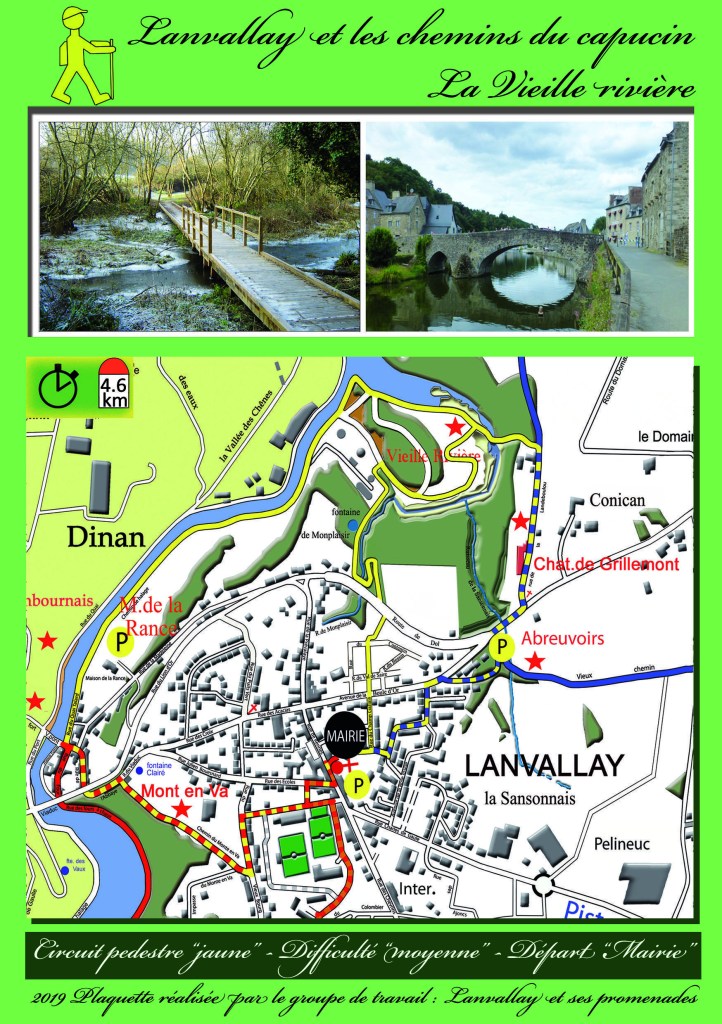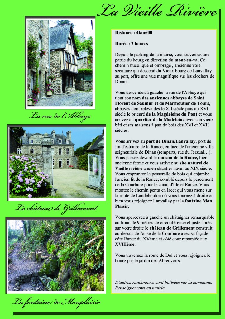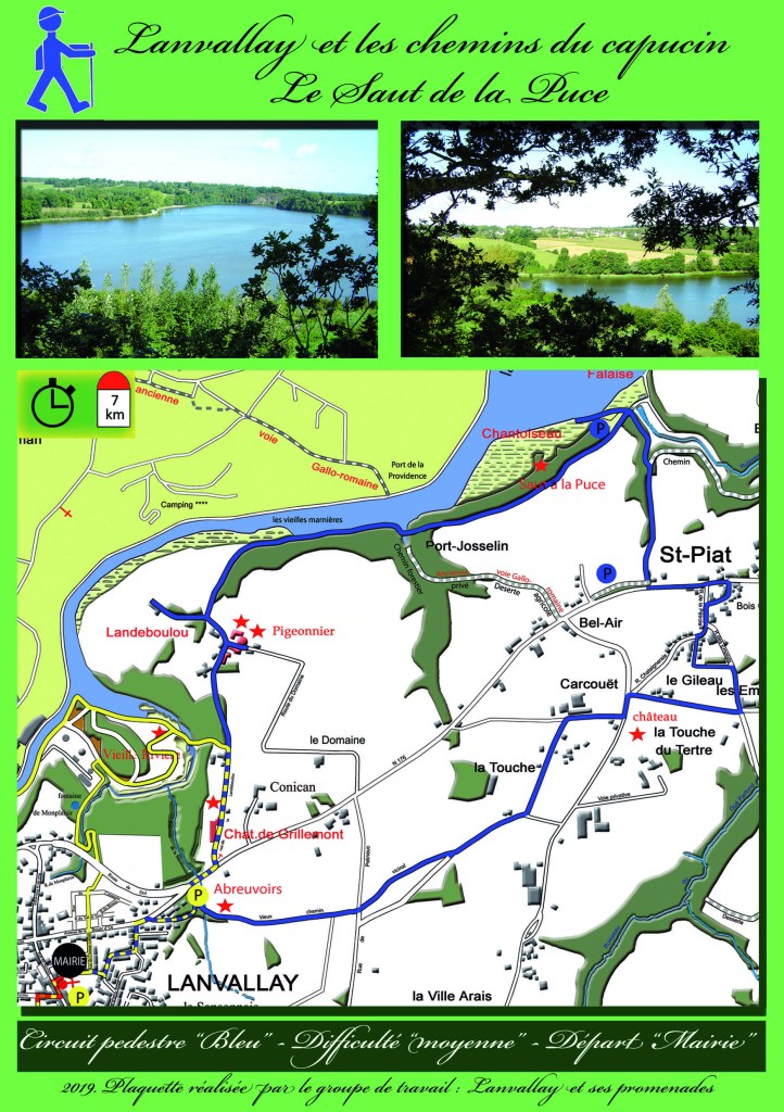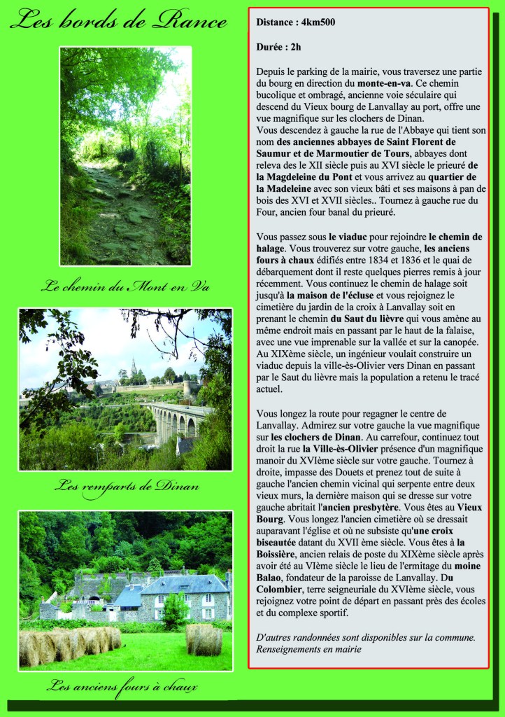 Vous découvriez donc ici même sur cette page les différents circuits proposés tous en effet téléchargeables depuis chez vous et qui sont : le bleu – le rouge – le jaune – l’orange et le violet. Aussi sur papier sachez qu’ils sont également tous disponibles à la Mairie de Lanvallay laissés entièrement à votre disposition (Les télécharger peut cependant vous permettre aussi de prévoir…ou de programmer votre propre promenade ; et surtout de zoomer aussi). .