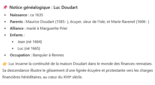 La fratrie Doudart ne se limitait pas aux alliances protestantes : elle plongeait aussi ses racines dans les charges financières rennaises. Luc Doudart, fils de Maurice, est attesté comme banquier à Rennes. Dans un siècle où les fonctions financières se transmettaient volontiers de père en fils, il est vraisemblable que leur père, Maurice Doudart, sieur de l’Isle, ait lui-même exercé des responsabilités similaires.
