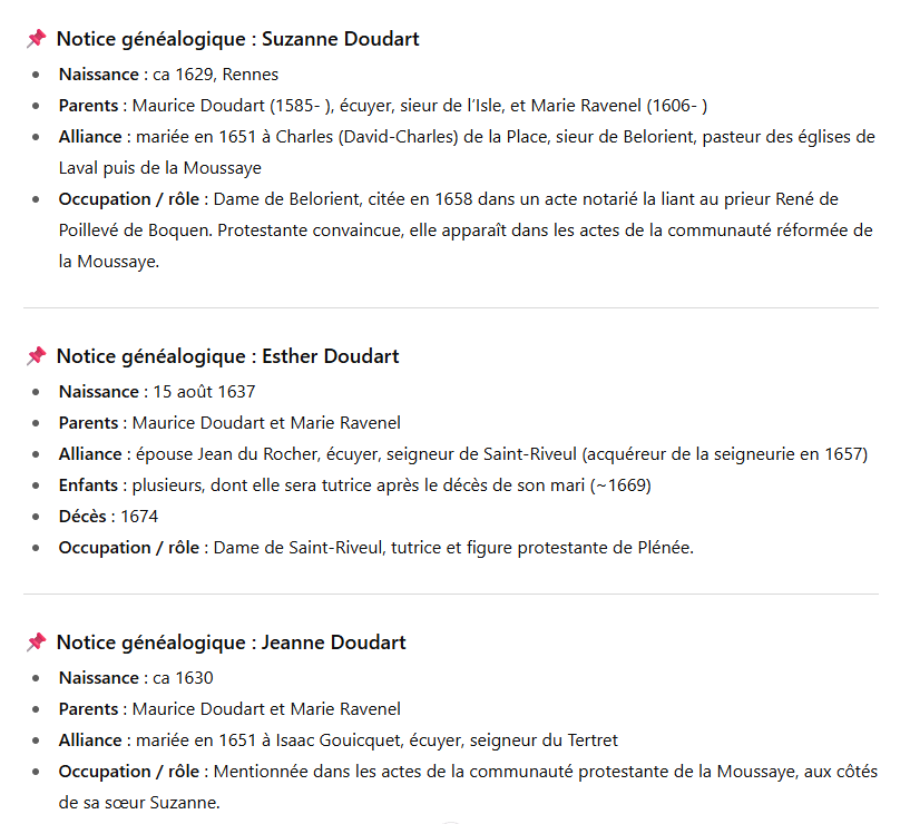 Grâce à ces actes notariaux et aux recoupements généalogiques, Suzanne Doudart n’est plus seulement un nom perdu dans une liasse. Elle réapparaît aujourd’hui au grand jour, replacée dans une fratrie marquée par la Réforme, aux côtés de ses sœurs Esther et Jeanne, toutes trois actives dans la communauté protestante de Plénée.