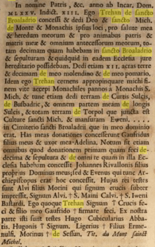 Ego Trehan de Sancto Broaladrio concessi et dedi Deo et Sancto Michaeli de Monte et monachis ipsius loci, pro salute mea et heredum meorum et pro animabus patris et matris mea et omnium antecessorum meorum, totam decimam quam habebam in Sancto Broladrio et sepulturam et quidquid in eadem ecclesia jure hereditario possidebam.
